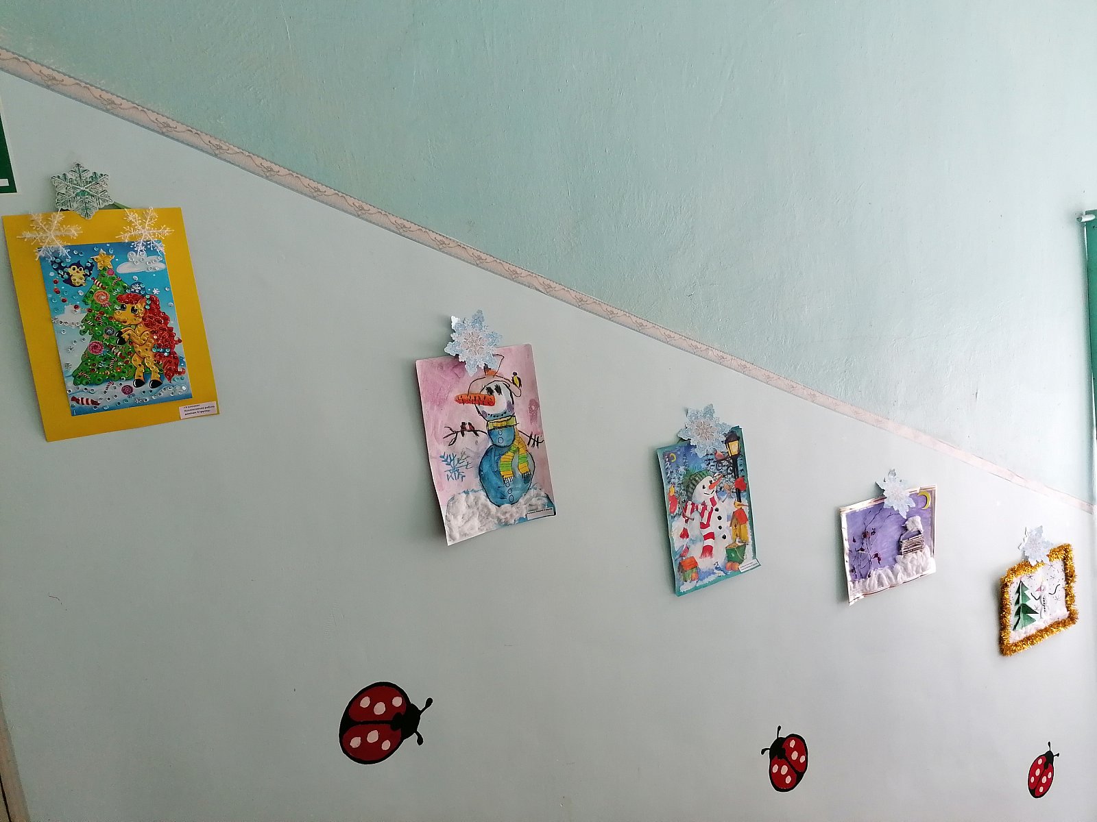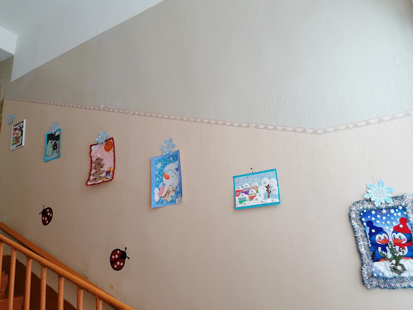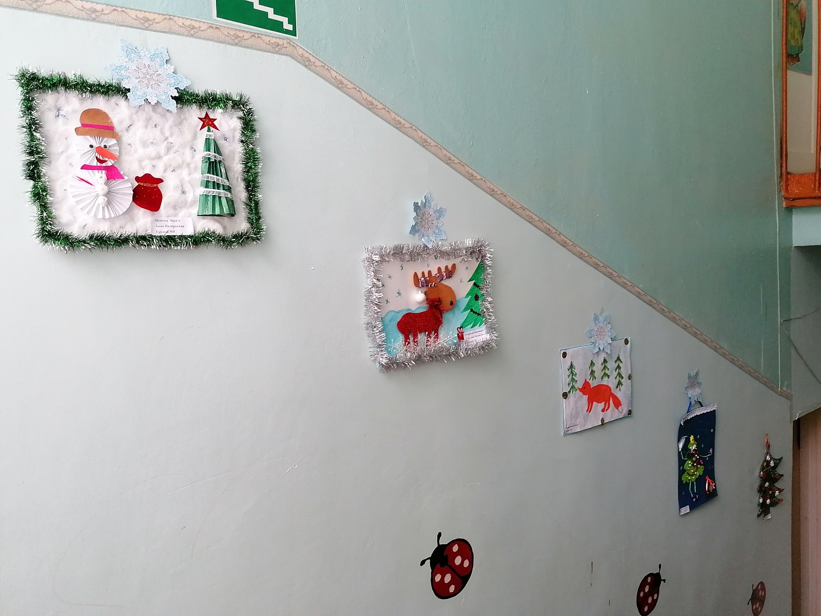 Лучшие работы украшают лестничные пролеты сада, создавая новогоднее настроение.